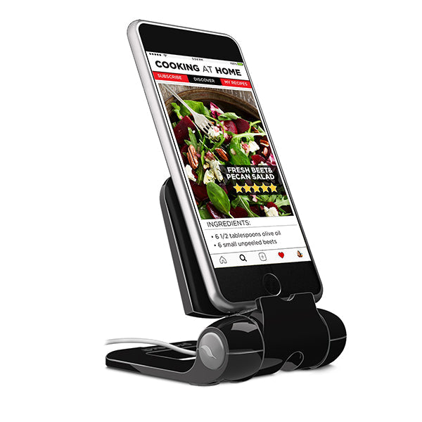 Cell phones and smartphones are our constant companions. Throughout our lives, devices give us instant access to work, videos, music, shopping, reading and more. The challenge is keeping your device supported, safe and steady while in use. Whether at home, at work, on a flight, or anywhere else, the right stand for your device is an integral piece of your smartphone experience. The iPrep Mini was designed to securely hold all popular cell phones and smartphones: all Apple iPhone models, Android, Amazon Fire, Samsung, Google Pixel and more. Prepara's iPrep Mini is an adjustable stand that will hold your device upright in portrait or landscape position, for easy viewing. The base is weighted for stability, the back is adjustable (simply press the hinge release button), and offers four usable viewing angles. The back features a non-slip rubber grip to hold the tablet in place. A channel through the base allows devices to charge in any orientation. When not in use, the iPrep Mini folds flat and for convenient storage and fits in any bag, backpack or purse.